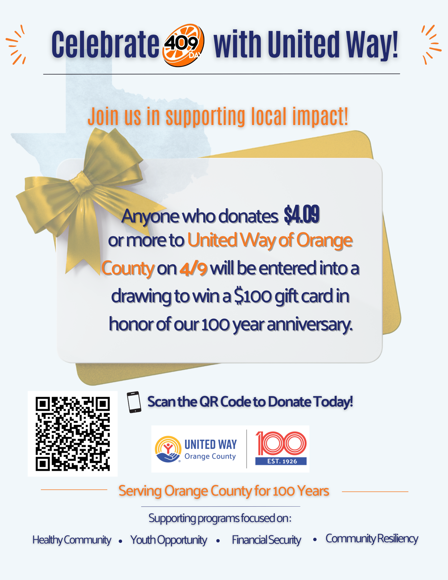 409 Day is a celebration of community, connection, and local pride. In honor of our 100-year anniversary, donate $4.09 to United Way of Orange County on April 9, 2026 for a chance to win a $100 gift card. Join us in making a difference right here in the 409.