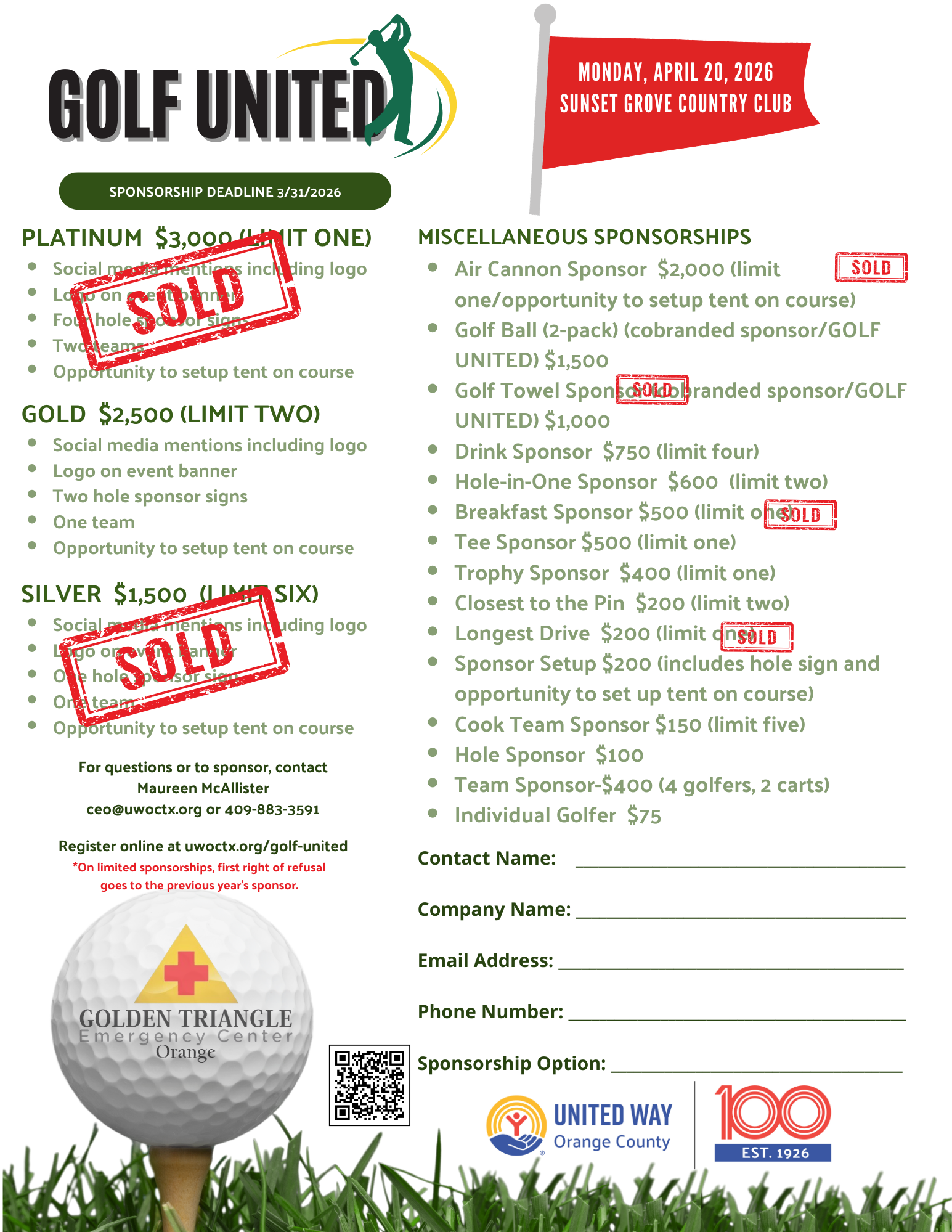 Join Golden Triangle Emergency Center on the greens for a day of fun while making a powerful impact in our community with a golf tournament to support United Way of Orange County. The tournament is a four-person scramble, par is your friend, and prizes will be paid for in merchandise and/or gift certificates from the pro shop. There will be a morning and afternoon flight. And we're brining back the Air Cannon, Tee It Forward, and Split the Pot.